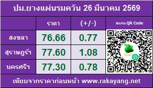 ราคาประมูลแผ่นรมควัน: ตลาดสงขลา 76.66 บาท/กก.  ราคาเพิ่มขึ้น 0.77 บาท/กก.   ปริมาณยาง   40,515 กก.