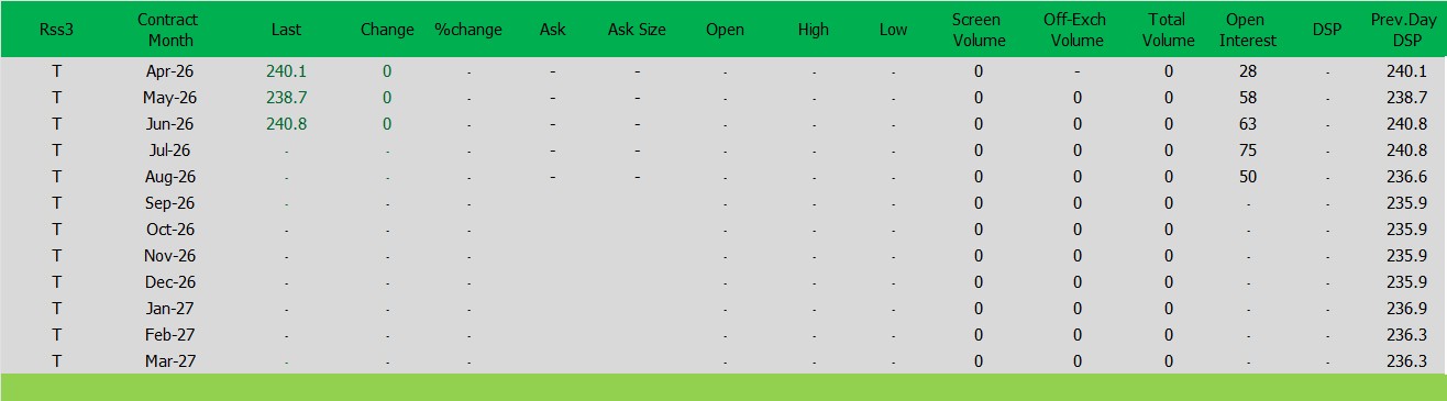 ราคายางRSS3 ตลาดยางSICOM ราคาส่งมอบเดือน เม.ย.ปิดที่240.1 เซนต์สหรัฐ  ราคาลดลง 0 เซนต์สหรัฐหรือ คิดเป็นเปอร์เซนต์ +0.00% %