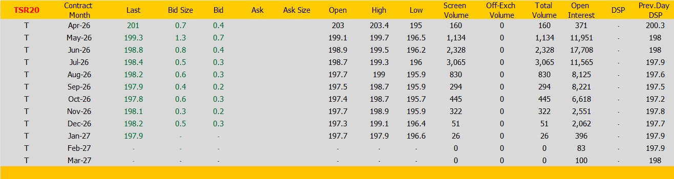 ราคายางTSR20 ตลาดยางSICOM ราคาส่งมอบเดือน เม.ย.ปิดที่201 เซนต์สหรัฐ  ราคาเพิ่มขึ้น 0.7 เซนต์สหรัฐหรือ คิดเป็นเปอร์เซนต์ +0.35% %