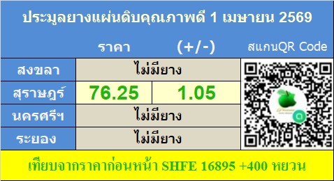 ส่วนราคาเฉลี่ยยางแผ่นดิบคุณภาพดีวันนี้ 76.25 บาท/กก. ราคาเฉลี่ยเพิ่มขึ้น 5.55 บาท/กก. จากวันก่อนหน้านี้