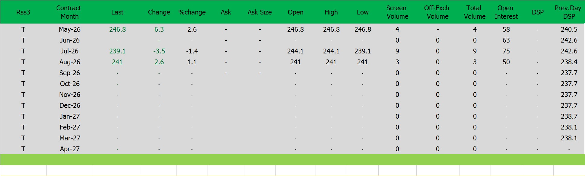 ราคาปิดตลาดยาง SICOMประจำวัน พุธ ที่ 1เมษายน2569ราคายาง RSS3 ราคาเดือนเม.ย. ราคาเพิ่มขึ้น 6.3เซนต์สหรัฐ ปิดที่ 246.8 เซนต์สหรัฐ