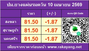 ตลาดกลางประมูลยางหาดใหญ่ (สงขลา) 81.50 บาท/กก.  ราคาลดลง   https://rakayang.net/vip/view.php?idr=31617