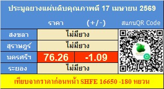 น้ำยางหาดใหญ่ 78.00 บาท ราคาลดลง -1.50 บาท