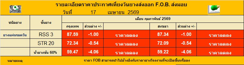 รายละเอียดราคาประกาศเที่ยงวันยางส่งออก F.O.B. ส่งมอบ ประจำวัน ศุกร์ ที่ 17 เมษายน 2569