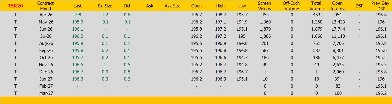 งTSR20 ตลาดยางSICOM ราคาส่งมอบเดือน เม.ย.ปิดที่198 เซนต์สหรัฐ  ราคาเพิ่มขึ้น 1.2 เซนต์สหรัฐหรือ คิดเป็นเปอร์เซนต์ +0.61% %