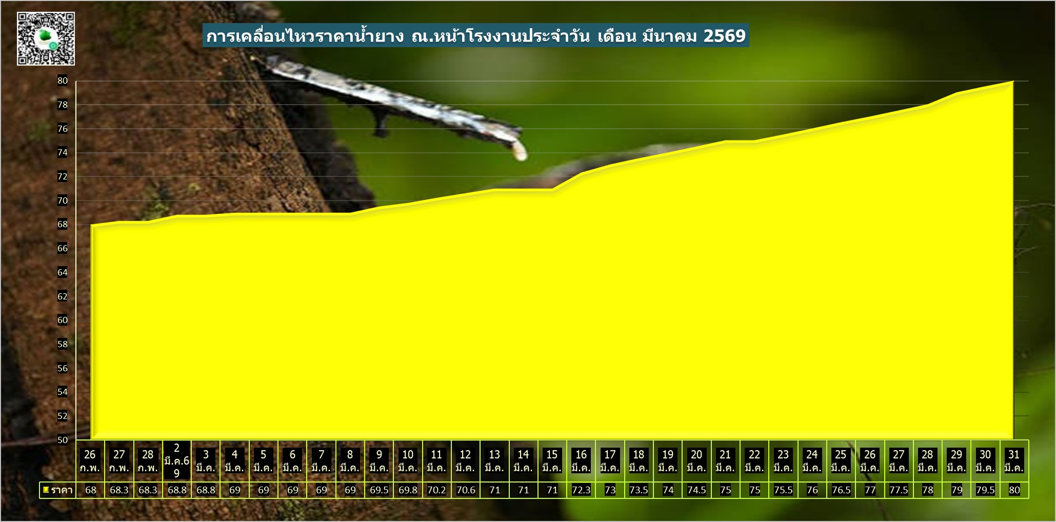 สรุปราคาน้ำยางโรงงานและลานท้องถิ่นทั่วไปประจำวัน อังคาร ที่ 31 มีนาคม 2569