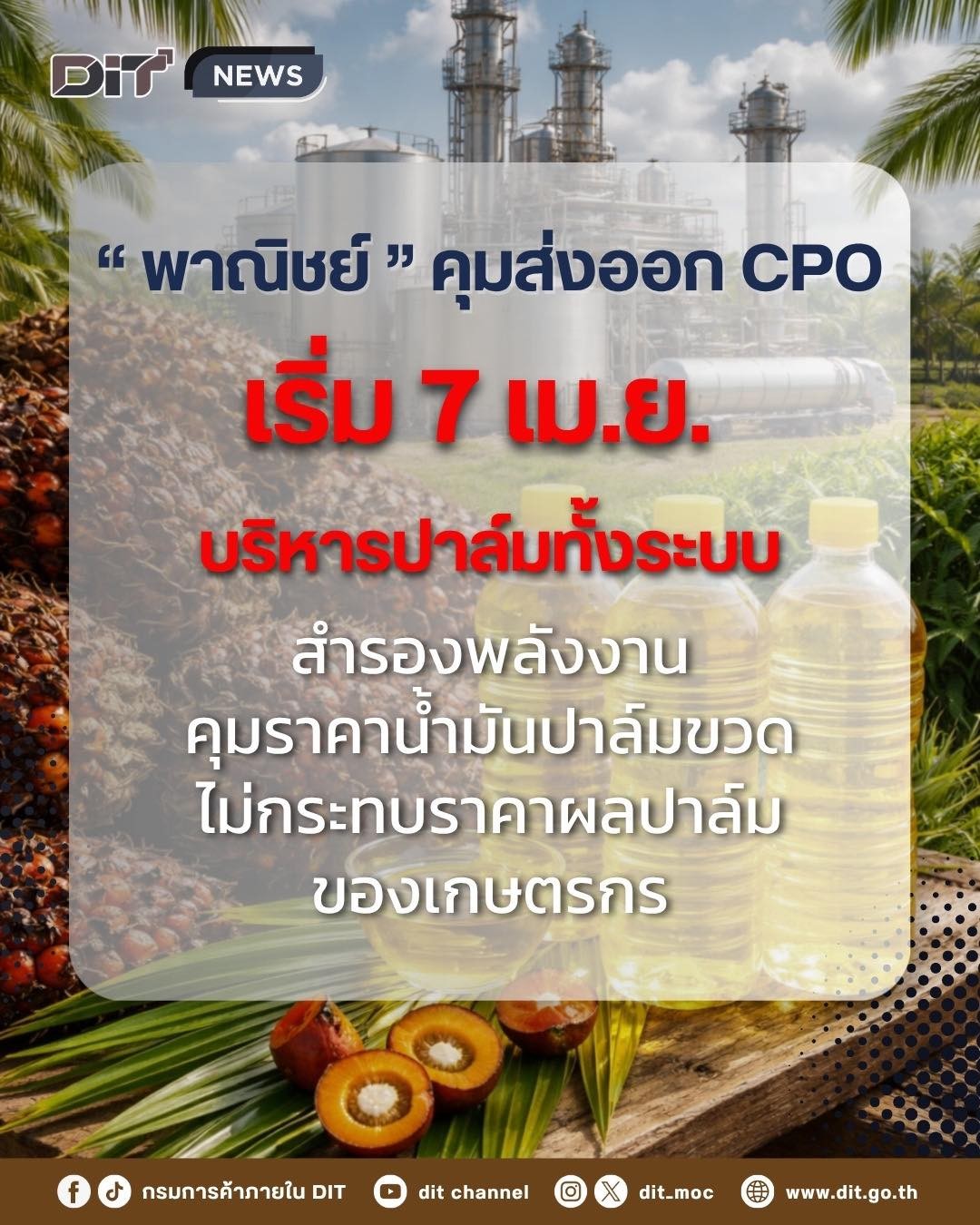 พาณิชย์คุมส่งออก CPO เริ่ม 7 เม.ย. บริหารปาล์มทั้งระบบ สำรองพลังงาน?คุมราคาน้ำมันปาล์มขวด?ไม่กระทบราคาผลปาล์มของเกษตรกร