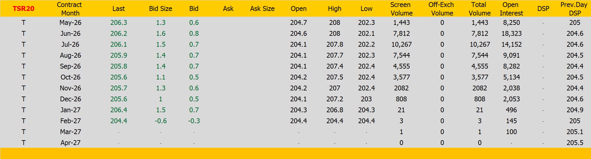 ราคายางTSR20 ตลาดยางSICOM ราคาส่งมอบเดือน พ.ค.ปิดที่206.3 เซนต์สหรัฐ ราคาเพิ่มขึ้น 1.3 เซนต์สหรัฐหรือ คิดเป็นเปอร์เซนต์ +0.63% %